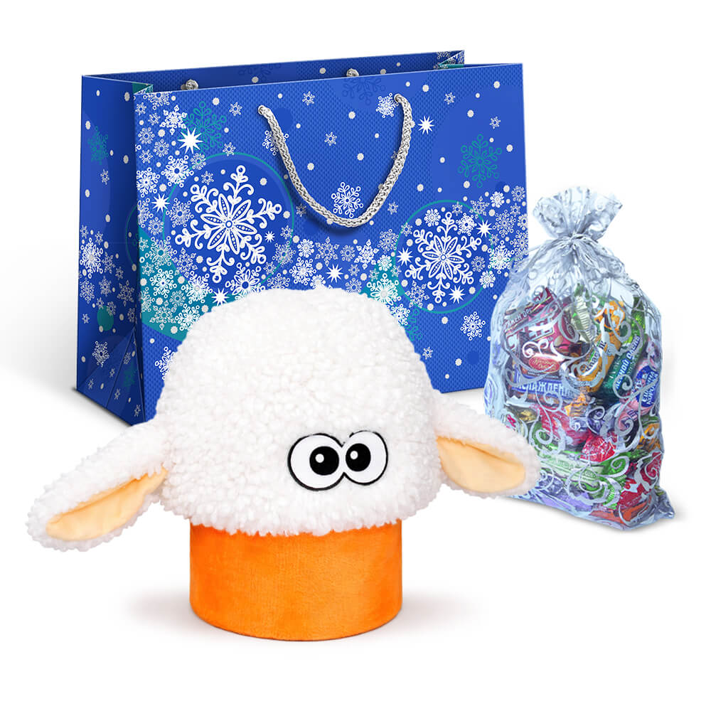 Набор "Барашек Санни" в новогоднем пакете с мягкой шапочкой овечкой и мешочком со сладким подарком 600г Премиум.