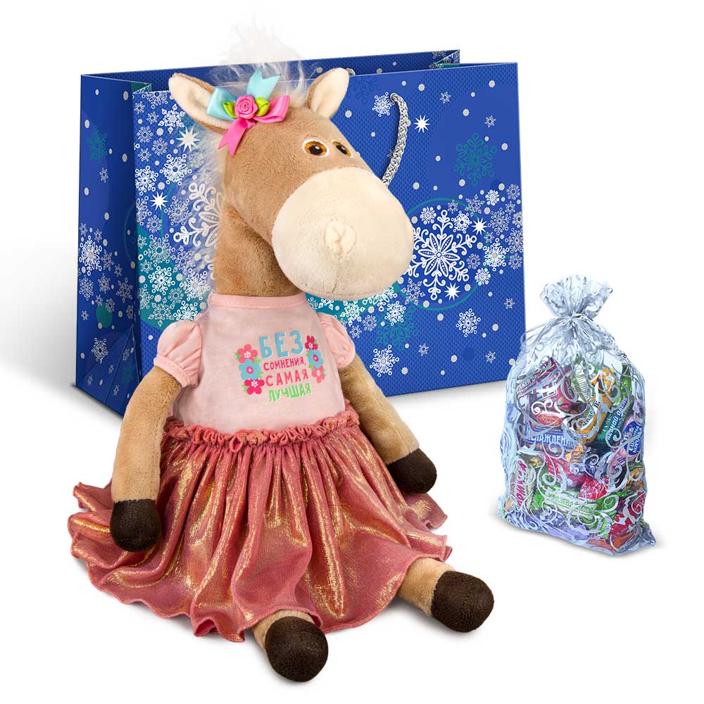 Набор Лурдес Шелдон в новогоднем пакете с мягкой игрушкой лошадкой и мешочком со сладким подарком 800г Стандарт.