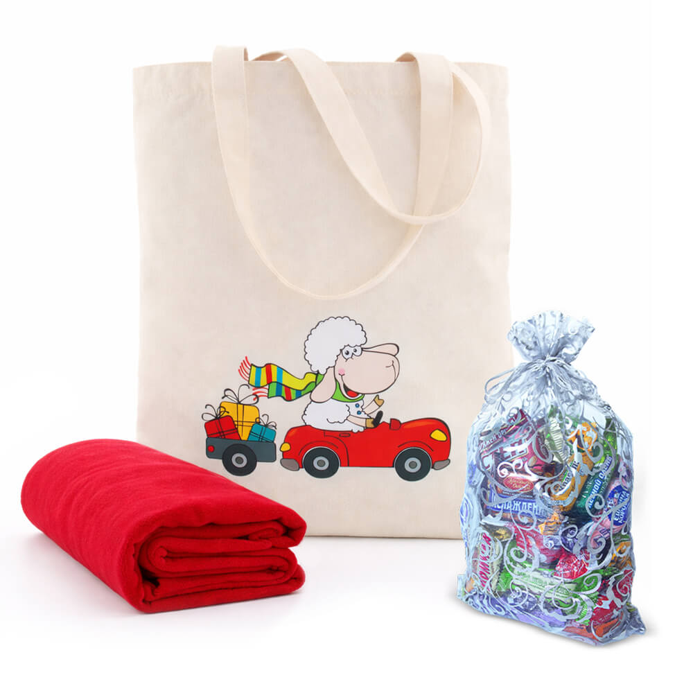 Набор "Праздник" в новогоднем шоппере с мягким пледом и мешочком со сладким подарком 600г Премиум.